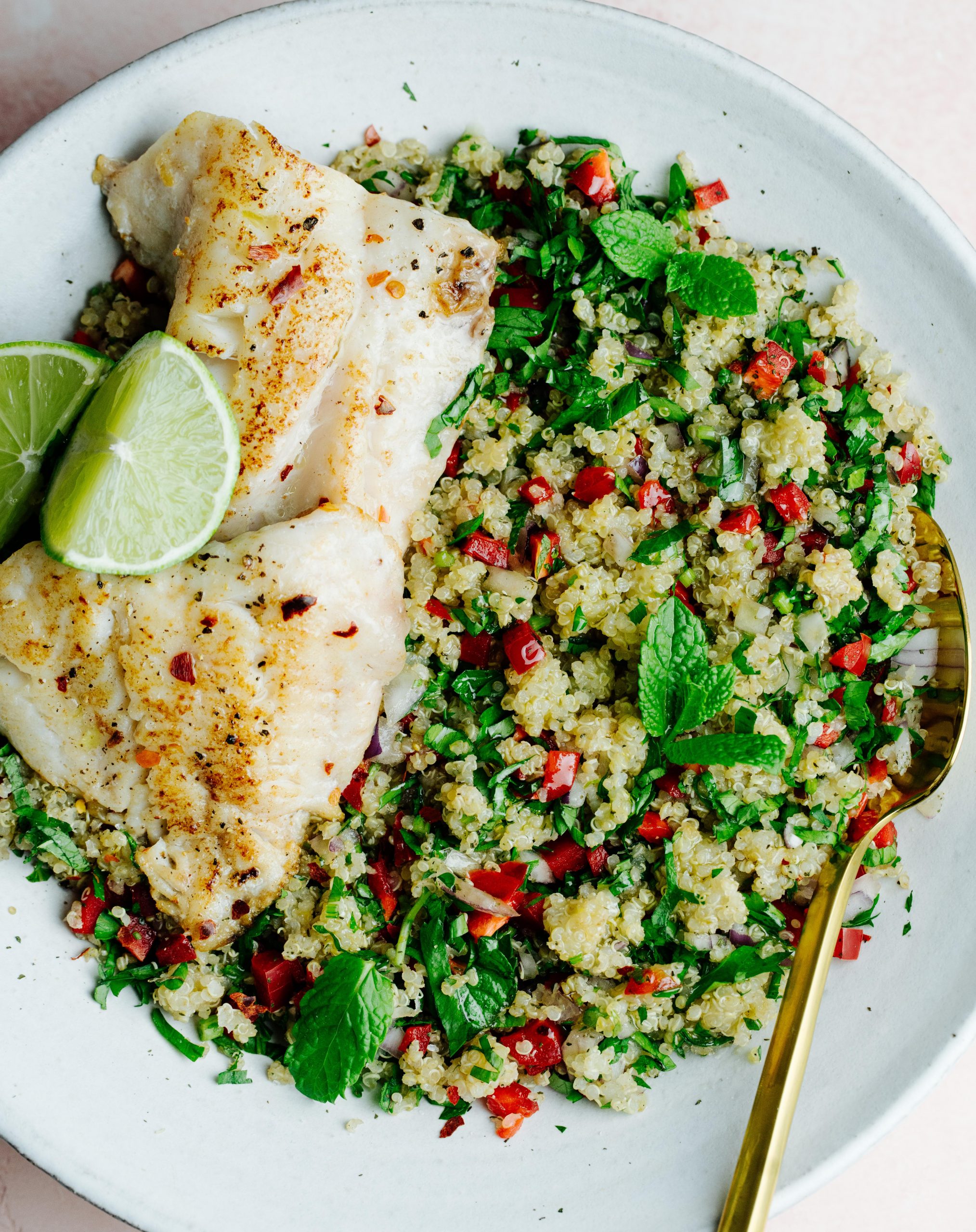 4. Den Salat in eine Bowl geben, den Fisch hinzufügen, mit Minze und Limettenviertel garnieren.