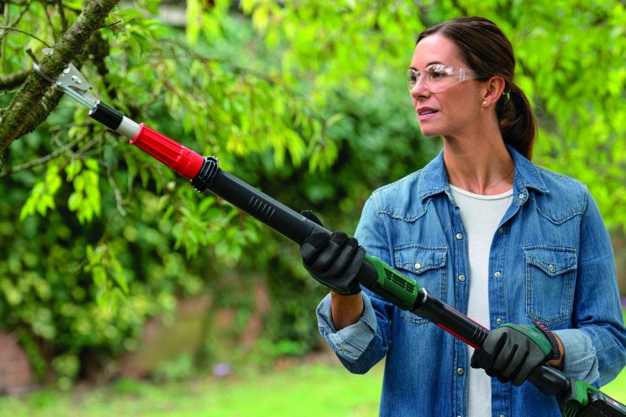 Um Sträucher und Obstbäume zu stutzen oder schmale Äste zurückzuschneiden, reicht in der Regel eine gute Schere. Besonders leicht geht die Arbeit mit einer Akku-Gartenschere, wie zum Beispiel der EasyPrune von Bosch, von der Hand. Mit ihr schneidet man mühelos Äste mit einem Durchmesser von bis zu 25 Millimetern und mit 490 Gramm liegt sie noch dazu gut in der Hand. Für dickere Äste von bis zu 45 Millimetern braucht es aber eine leistungsstärkere Gartenschere, wie die AdvancedPrune 18V-45, die mit einem 360°-Startschalter das Schneiden auch an engen Stellen unabhängig vom Arbeitswinkel erlaubt. Dank Verlängerungsstange kann die Reichweite von 1,2 m auf 1,8 m erhöht werden. Voll geladen bietet sie eine Schnittkapazität von zirka 600 Schnitten mit einer Geschwindigkeit von unter 1,2 Sekunden pro Ast.