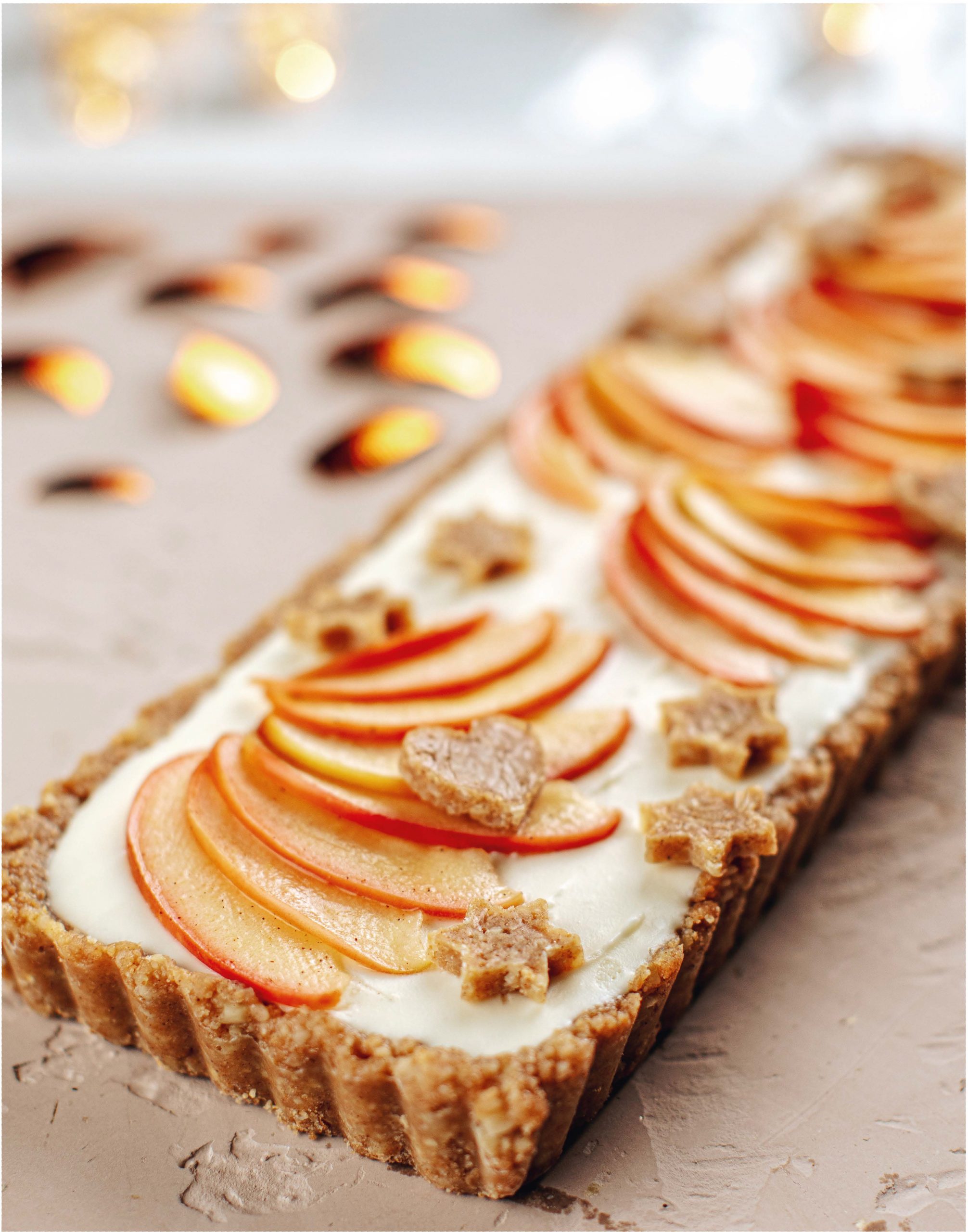 Den Apfel in feine Spalten schneiden, mit dem Zucker, dem Vanillemark und dem Zimt kurz aufkochen. Die Tarte damit und mit den kleinen Sternchen oder Herzchen verzieren.